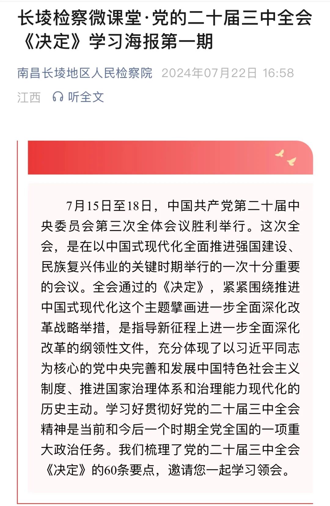 持续推进检察全媒体传播体系建设,根据疫情期间长堎检察人员坚守岗位、履职尽责的故事,推出9期“坚守:战‘疫’风采系列”宣传作品,努力让更多检察故事走向群众;结合深入开展学习贯彻习近平新时代中国特色社会主义思想主题教育、学习贯彻党的二十大和二十届三中全会精神、党纪学习教育等重点工作,创新推出171期“长堎检察微课堂”海报,积极创作原创宣传稿件,大力宣传习近平新时代中国特色社会主义思想的检察实践。