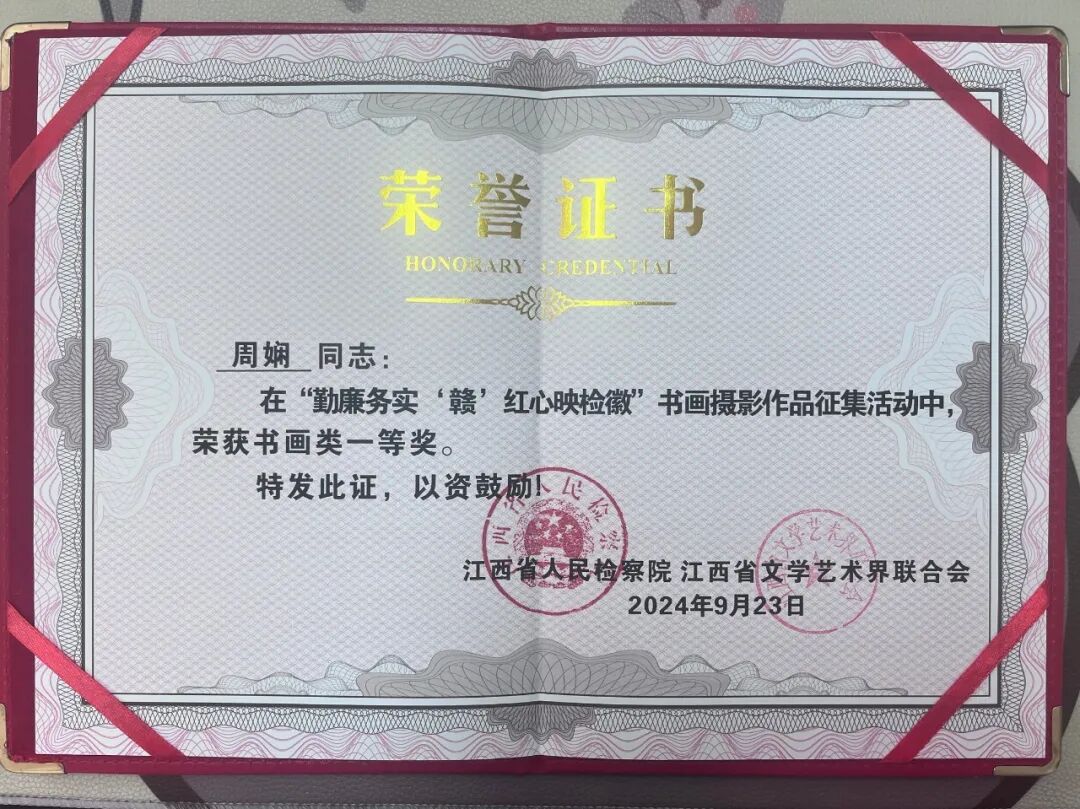 近期,在省检察院、省文学艺术界联合会举办的“勤廉务实‘赣’ 红心映检徽”书画摄影作品竞赛活动中,江西省南昌长堎地区人民检察院周娴同志创作的《习近平总书记对政法工作重要指示摘录》荣获书法作品一等奖,成为近年来江西省南昌长堎地区人民检察院扎实推进文化润检、文化兴检的一个缩影。