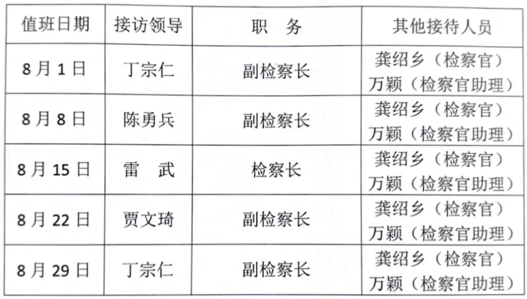 【贯彻政法工作条例】长堎地区检察院2024年8月“检察长接待日”工作安排
